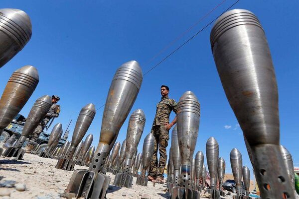 A member of the Iraqi security forces stands between Islamic State ammunition being displayed in al-Alam Salahuddin province.Thaier Al-Sudani/Reuters