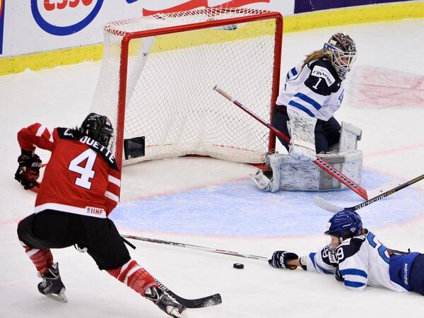 Canadian Brigitte Lacquette (4) scores the opening goal past Finlands goalkeeper during the 2015 IIHF Ice Hockey Women's World Championship group A match between Canada and Finland at Malmo Isstadion in southern Sweden. Canada went on to win by a score of 6-2.Claudio Bresciani/AFP / Getty Images