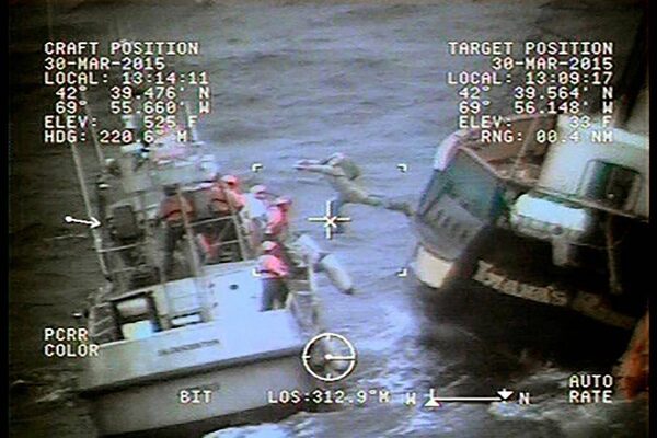 A crew member jumps from a disabled tall ship onto a U.S. Coast Guard cutter during a rescue mission 58 miles (93.3 kms) east of Gloucester, Massachusetts. the Coast Guard Cutter Ocracoke rescued nine crew members from the Canadian Tall Ship Liana's Ransom.U.S. Coast Guard/Reuters