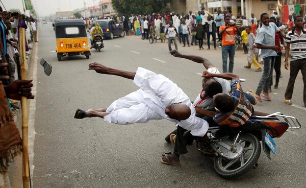 Supporters of presidential candidate Muhammadu Buhari collide with a motorbike carrying another supporter during celebrations in Kano Nigeria.Goran Tomasevic/Reuters