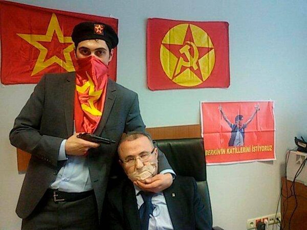 A gunman poses with Prosecutor Mehmet Selim Kiraz with a gun on his head after being taken hostage in his office in a court house in Istanbul. A far-left Turkish group took the Istanbul prosecutor hostage on Tuesday and threatened to kill him.Reuters