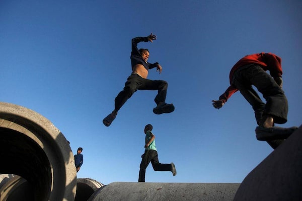 A boy from the slum jumps from one concrete drainage pipe to another along the bank of Bagmati River as he plays with his friends, in Kathmandu.Navesh Chitrakar/Reuters