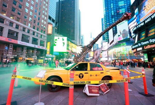A 15-foot replica of Gorehowl, a weapon from Blizzard Entertainments World of Warcraft, crushes a taxi cab in Times Square NY, in anticipation of Thursday Ãs release of World of Warcraft: Warlords of Draenor.Amy Sussman/The Associated Press