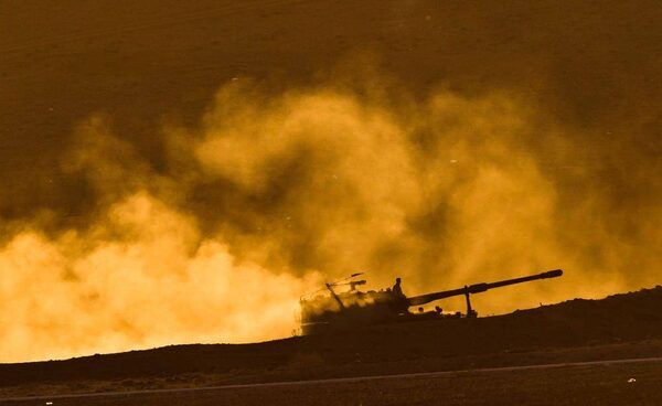 A Turkish military mobile artillery unit drives at sunset on a hill overlooking the Syrian city of Kobani, on the Turkey-Syria border.Vadim Ghirda