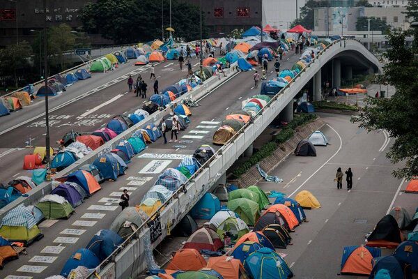 Pedestrians walk past tents at a pro-democracy protest site setup on a highway in the Admiralty district of Hong Kong.Philippe Lopez/AFP / Getty Images