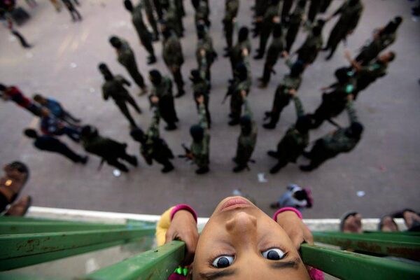A Palestinian girl looks on as members of Hamas's armed wing take part in an anti-Israel rally in Rafah in the southern Gaza Strip.Ibraheem Abu Mustafa/Reuters