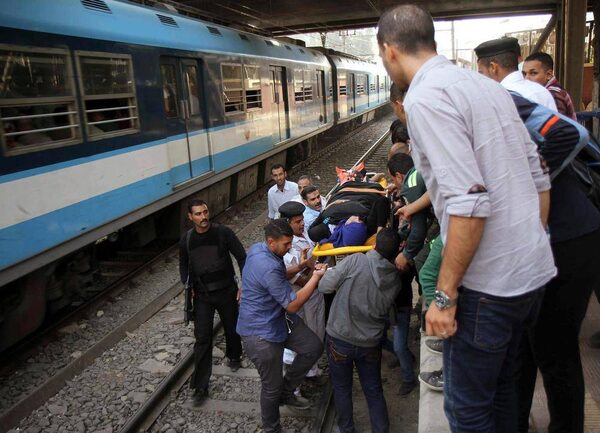 Egyptian policemen carry an injured woman at the Hilmiyat al-Zaytoun metro station, where a home-made bomb exploded, in Cairo, Egypt.Al Youm Al Saabi/Reuters