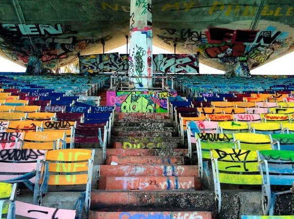 Graffiti covers the 6,500-seat Miami Marine Stadium which was built on an island near Miami. Preservationists seeking to restore the stadium received a boost with the announcement that the Miami International Boat Show is moving to the arena.Zachary Fagenson/Reuters
