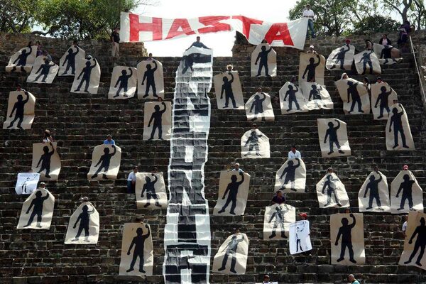 Activists of the Comuna organization hold painted silhouettes representing the 43 missing students at the archaeological site of Monte Alban in Oaxaca. Anger has intensified in Mexico since Attorney General Jesus Murillo said last week that evidence suggests 43 missing trainee teachers were murdered by gangsters.Stringer/Reuters