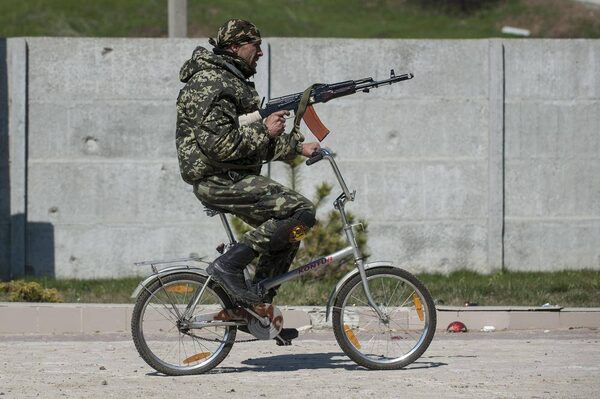 A Ukrainian serviceman rides a bicycle in Shyrokyne, eastern Ukraine. Russia and Ukraine agreed in Berlin on Monday to call for the pullback of smaller-caliber weapons from the front lines of the conflict that has claimed more than 6,000 lives.Evgeniy Maloletka/The Associated Press