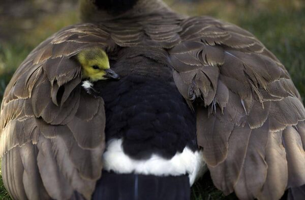 A gosling peers out from its mother's wings Wednesday in Santa Clara, Calif.Marcio Jose Sanchez/The Associated Press