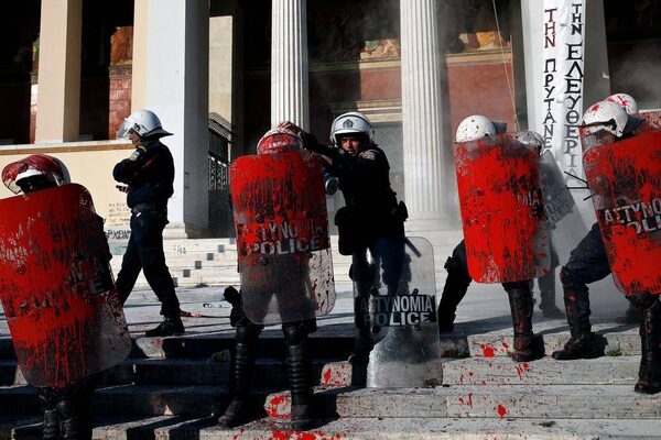 Riot police stand guard with red paint on their shields, thrown by anti-establishment protesters during a demonstration against high security prisons in Athens.Alkis Konstantinidis/Reuters