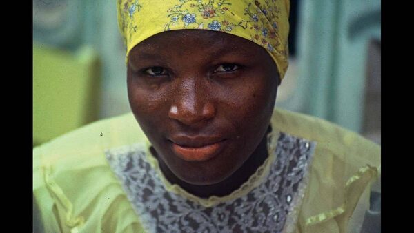 Portrait of a woman passing in front of posted football scores at an intersection in Stone Town Zanzibar.Ted Glenn