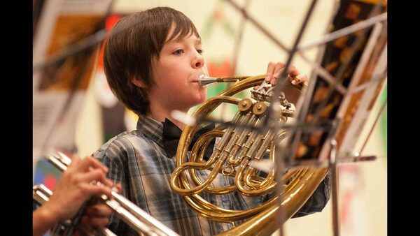 In his element with black bow tie and french horn.Tony R. Wagstaff