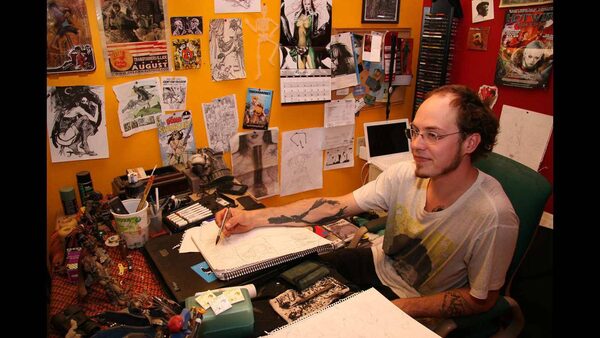 Calan is a independent comic book artist based in Calgary, AB. This photo is of him working in his colorful home office where he is surrounded by pictures and things that bring him inspiraiton. 2010.Marina Giannitsos