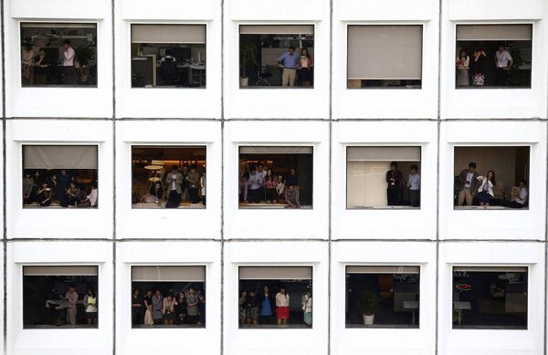 People in their offices watch South Korean troops during a military parade on a street during a ceremony to mark the 65th anniversary of Armed Forces Day in central Seoul October 1, 2013.