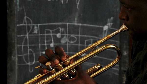 Seventeen-year-old Steve Odieno blows into a trumpet during band practice at a local school in the Korogocho slum in Nairobi on October 16, 2010. Odieno, who was born and raised in Western Kenya, is the eldest of five siblings and came to live in Nairobi with his father and to look for better quality schooling.ROBERTO SCHMIDT