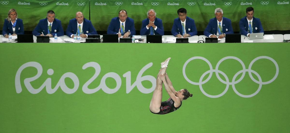 Judges watch as Rosie MacLennan competes in women's trampoline in Rio. (Ruben Sprich/Reuters)