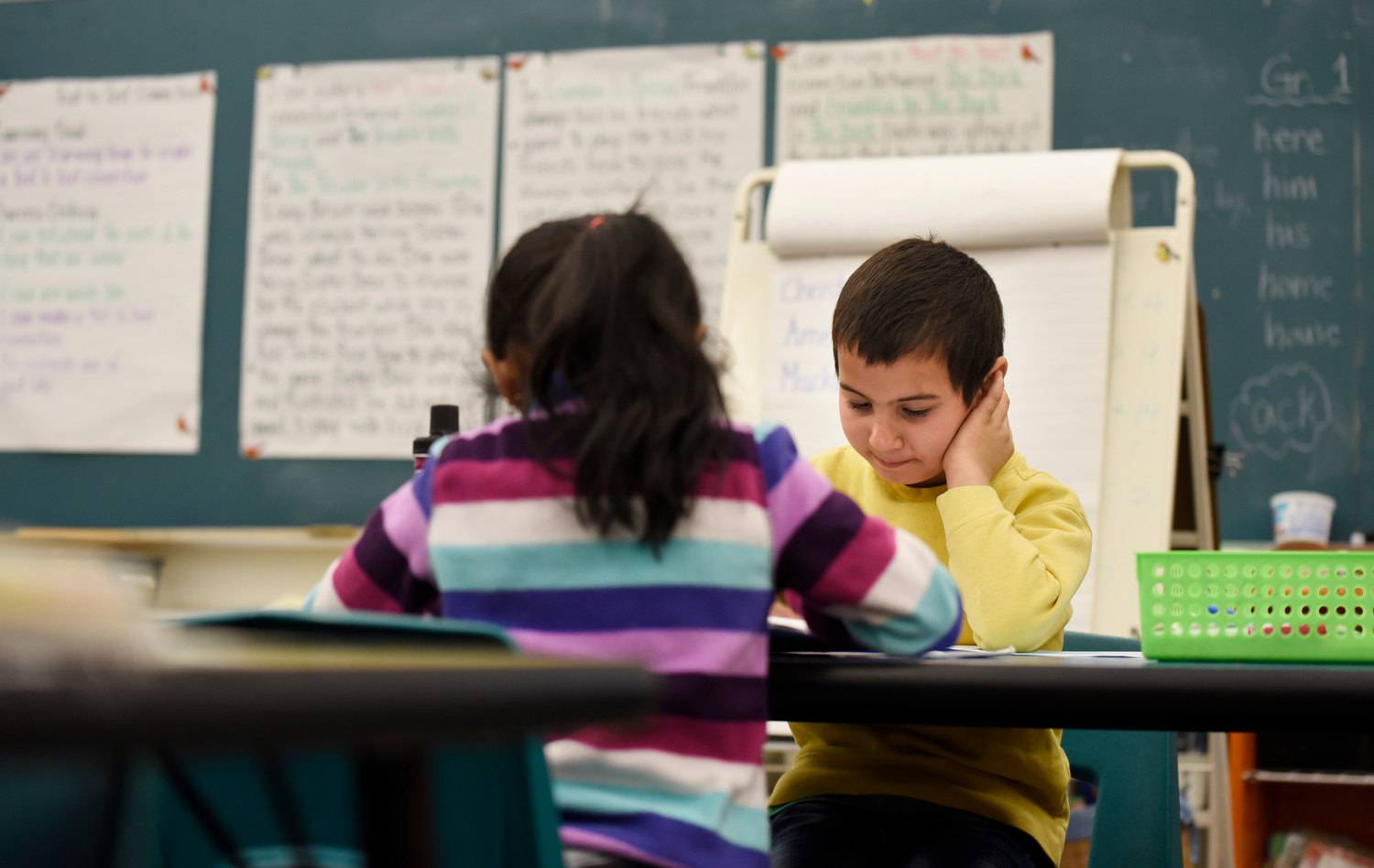 Seven year old Mouaataz Al Rassoul (right) during his first day in school.