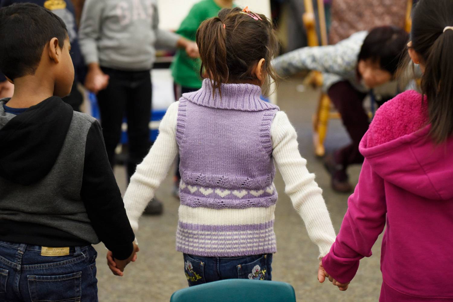 Five year old Mariah Al Rassoul holds hands with classmates Aarush (left) and Kaili (right) during her first day in kindergarten.
