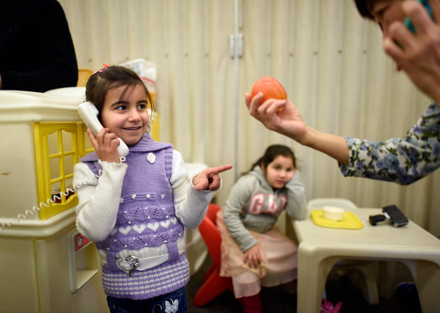 Mariah Al Rassoul plays with a toy phone during her first day in kindergarten.