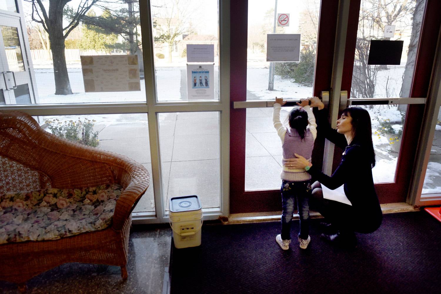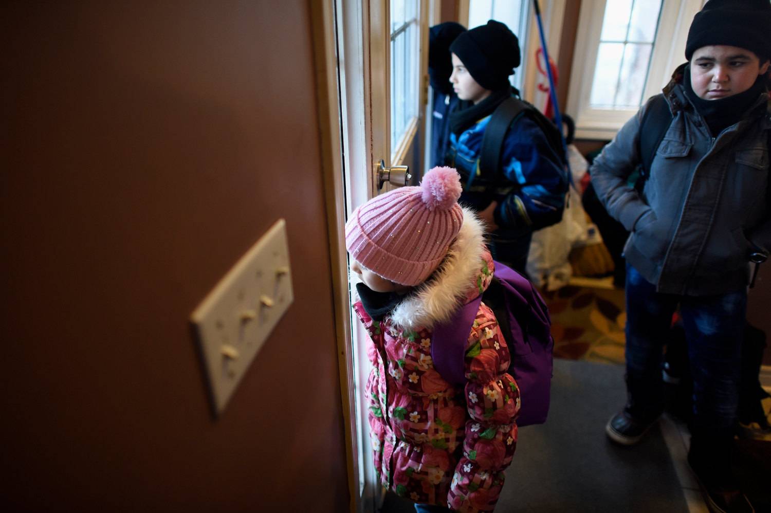 Five year old Mariah Al Rassoul peers out the window of her Scarborough home before leaving for school.