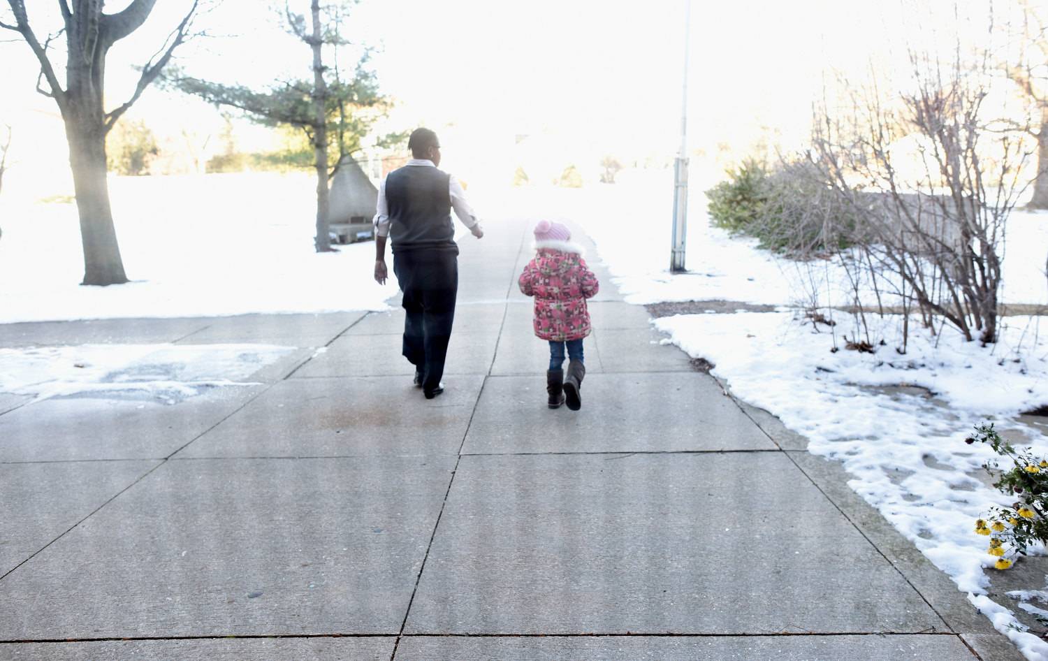 Marcia Pate, principal of Iroquois Junior Public School walks out the front door with five year old Mariah Al Rassoul after the five year old became upset during her first day in kindergarten.