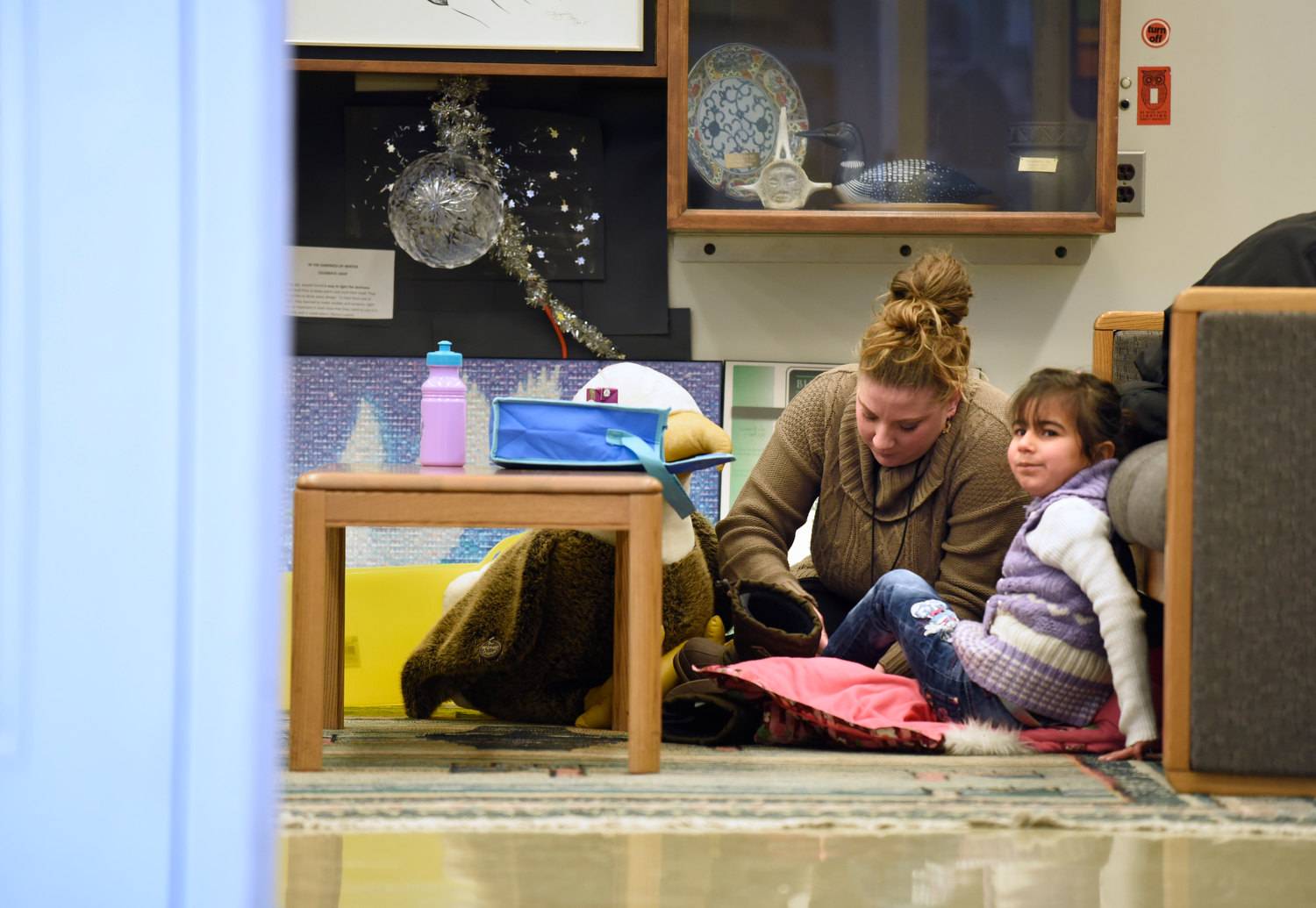 Early childhood educator Shelley Sochan comforts five year old Mariah Al Rassoul after she became upset when an older brother and family friends left.