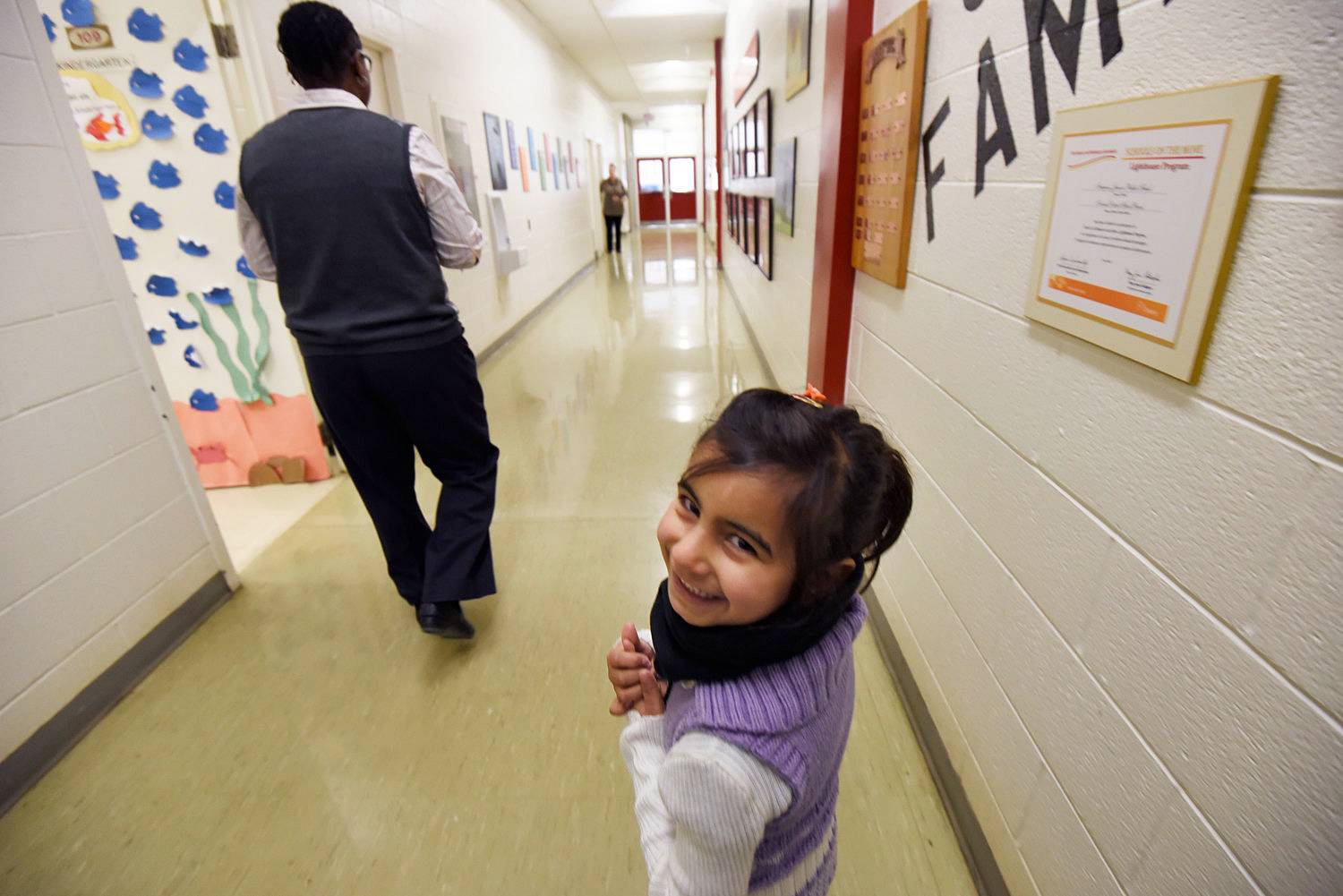 Five year old Mariah Al Rassoul follows Iroquois Junior Public School principal Marcia Pate to her first kindergarten class.