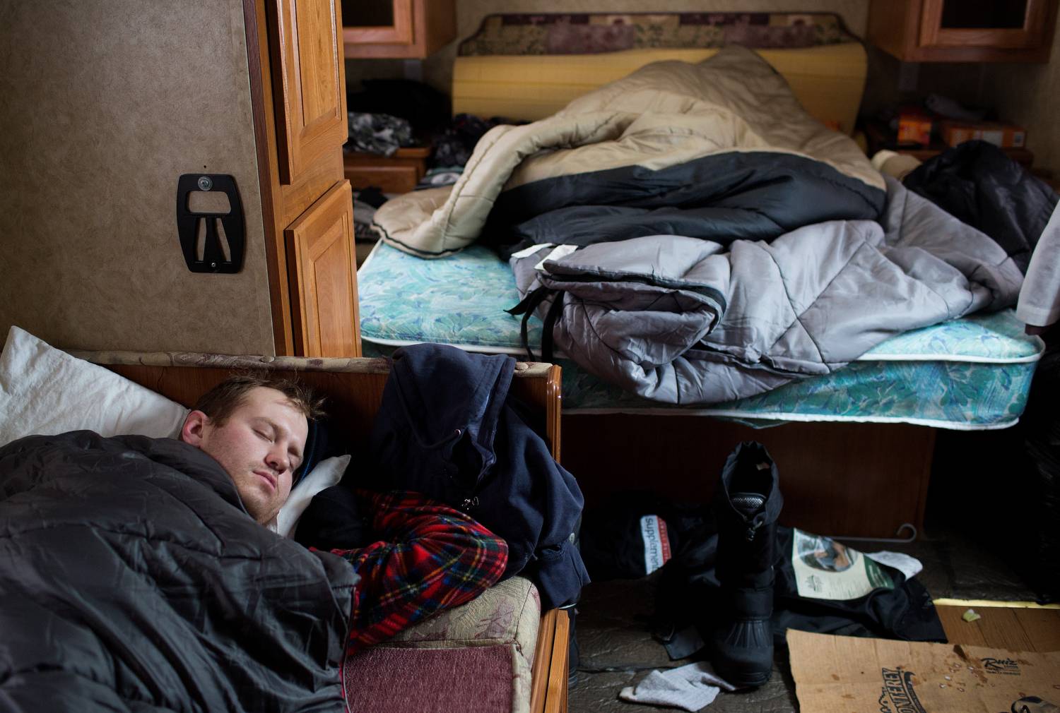 Kyle Langstaff sleeps in one of the trailers during a break from game.