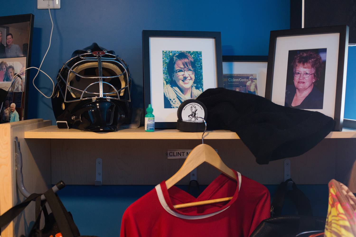 Family photos sit on top of lockers in the dressing room.