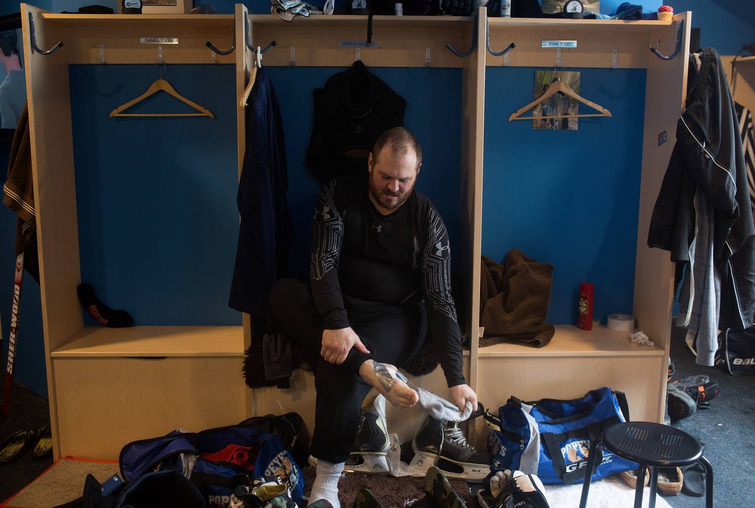 Andrew Langstaff pulls off his socks after finishing a shift.