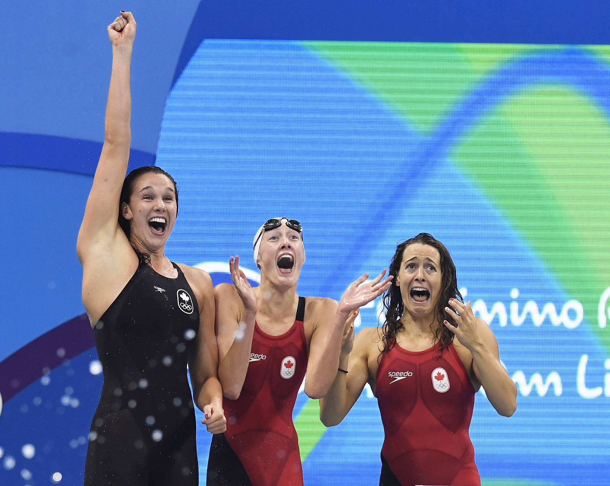 Canadian women's 4x100-metre freestyle relay team Chantal Van Landeghem, Taylor Ruck, Sandrine Manville and Penny Oleksiak (not shown), celebrate their bronze medal. (Frank Gunn/The Canadian Press)