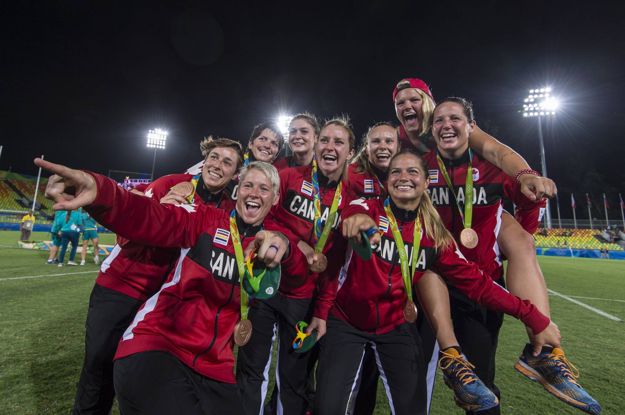 Team Canada celebrates their bronze medal win in Rugby Sevens. (John Lehmann/The Globe and Mail)