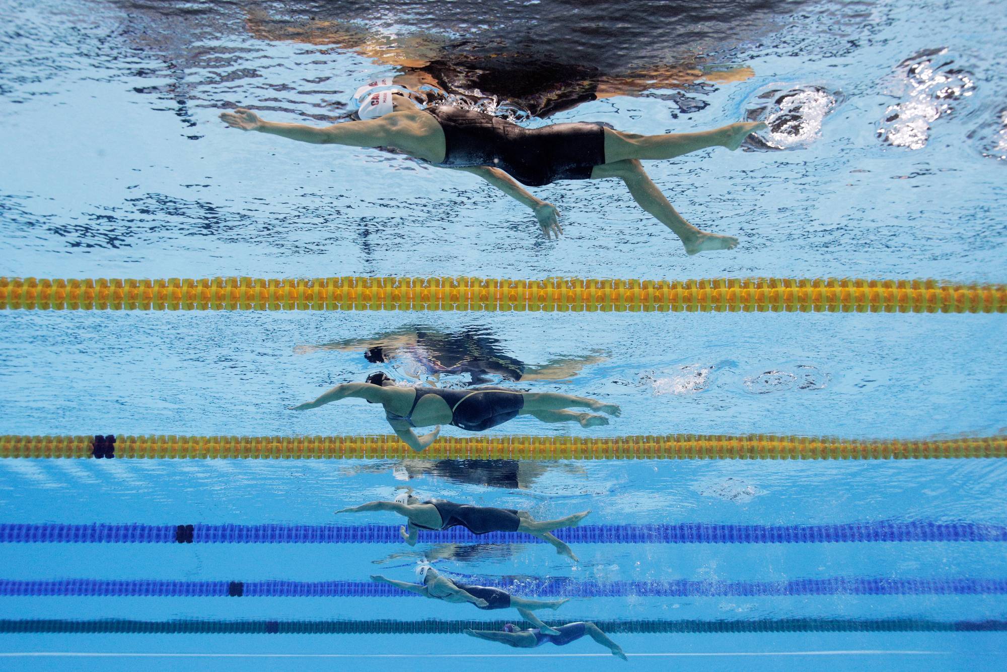 Top of frame is Kylie Masse of Canada in the women's 100m backstroke. (Adam Pretty/Getty Images)