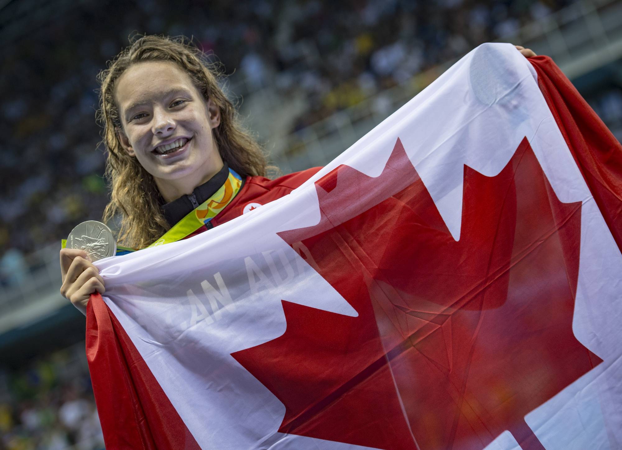Canadian Penny Oleksiak poses with her silver medal in the women's 100m butterfly. (John Lehmann/The Globe and Mail)
