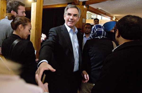 Alberta Progressive Conservative Leader Jim Prentice shakes hands with supporters during a campaign stop in Edmonton on Tuesday April 14, 2015. A poll released on Wednesday sampled 3,121 people and found the Wildrose Party and the NDP arm-locked in the lead, each with 24 per cent of the voters, while the PCs came in third at 18 per cent.Jason Franson/The Canadian Press