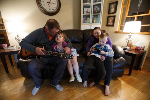 Shaun and Amanda Westhaver comfort daughter Annie, 3, and son, Rhys, 5, at a friend’s home in Edmonton on Monday.Codie McLachlan/The Globe and Mail