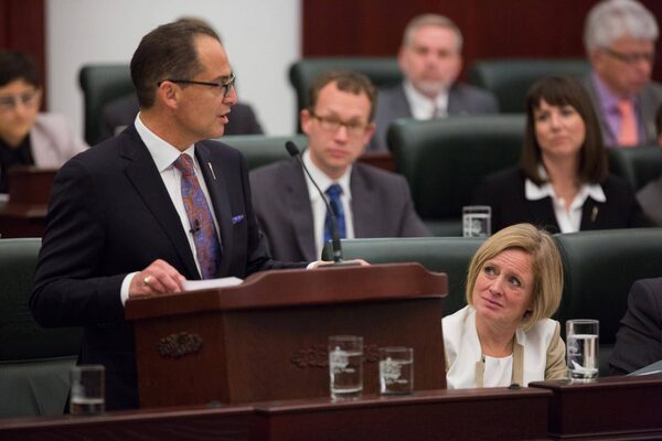 Alberta Premier Rachel Notley, right, looks on as Finance Minister Joe Ceci presents the release of the 2015 provincial budget to the Legislative Assembly in Edmonton on Oct. 27, 2015.TOPHER SEGUIN/The Canadian Press