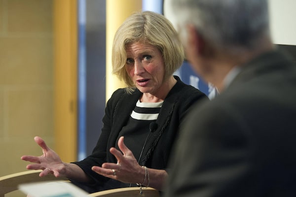 Alberta Premier Rachel Notley answers a question from Bob Perciasepe, president, Center for Climate and Energy Solutions, following her 2015-2016 Thomas O. Enders Memorial Lecture on U.S.-Canadian Relations at the Johns Hopkins University School of Advanced International Studies in Washington, Thursday, April 28, 2016.Cliff Owen/The Associated Press