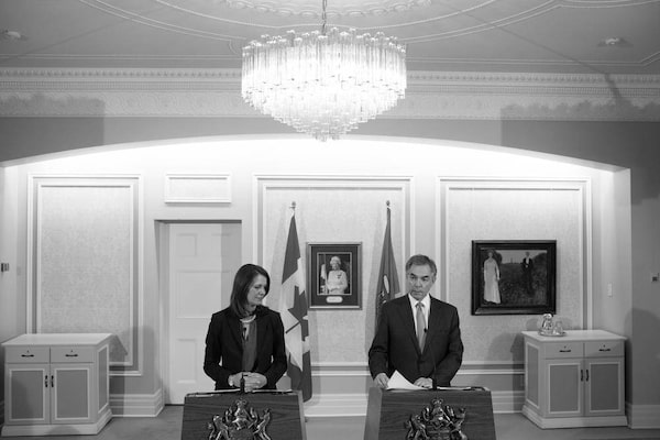 Premier Jim Prentice and former Wildrose Party leader Danielle Smith speak to the media in Edmonton, Alberta on Wednesday, December 17, 2014. Prentice did not say when or if he would be shuffling cabinet.Amber Bracken/The Globe and Mail