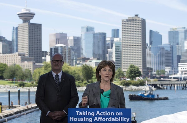 British Columbia Finance Minister Michael de Jong, left, looks on as Premier Christy Clark announces that the government will end self-regulation in the real estate industry in the province.Jonathan Hayward/The Canadian Press