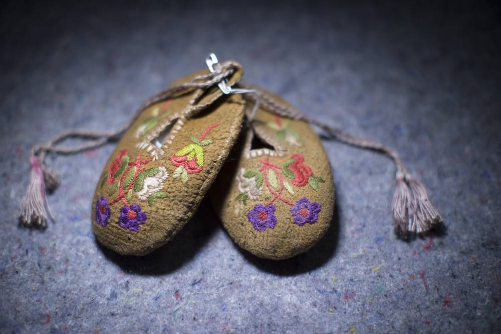 It was rarely spoken about, what happened to Marilyn Murray’s mother at St. Joseph’s Residential School in Fort Resolution, Northwest Territories. Ms. Murray did know that her mother, then Florence Dodman, had been sent there when she was about 10, along with her five siblings – after their mother, who was Gwitchin, died giving birth to her seventh child. Ms. Murray also heard about her mother’s little sister Alice. There was a day when Alice, who was seven, was very ill, but was forced to play outside nevertheless. Florence, seeing how grave her sister’s condition was, pounded on the school doors “for what seemed like forever” before someone took Alice in. “That was the last time they ever saw or heard of her,” says Ms. Murray. Efforts to find any information years later were fruitless. Then, a few years ago, Ms. Murray was watching a CBC program about the residential schools when there was a shot of that school’s graveyard. “Suddenly the camera focused in on a close-up of a grave, and there it was: ‘Alice Dodman.’ ” Ms. Murray phoned her mother. “She was sobbing. She said I can’t believe what we just saw,” she recalls. The documentary encouraged her mother to speak about her residential school experience. When Florence moved in with Marilyn a year before her death (at 86, in 2012), she brought a shoebox full of personal belongings – treasures Marilyn had never seen. Packed in the box was a pair of small caribou-hide moccasins, made by Florence’s mother and worn by each of her children who lived, before they were sent away to school. When Ms. Murray heard about the Witness Blanket, she knew the moccasins belonged with it. “It helped me through my grieving period for my mother,” said Ms. Murray, holding the little shoes, “that I could do something for her that was never spoken about until the last five years of her life.”