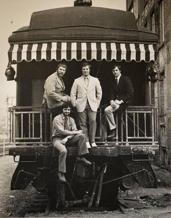 Bob Saunders (C) with some of the other investors pose on the train Saunders slept in for a few months in Vancouver's Gastown in this undated photo.JOHN LEHMANN