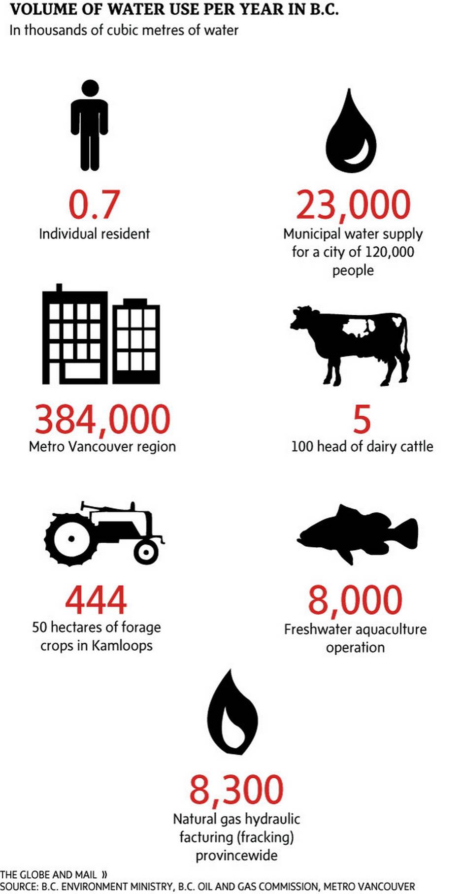 The current water shortage is also drawing attention to water-intensive industries, including agriculture, Alberta’s oil sands and B.C.’s potential liquified natural gas sector. And it has renewed debate over B.C.’s arrangements with bottled-water giant Nestlé Waters Canada. The company extracts groundwater from an aquifer near Hope for free, but under new legislation that takes effect next year, will be charged a fee of $2.25 per million litres of water to access the water – a price many maintain is not high enough.
