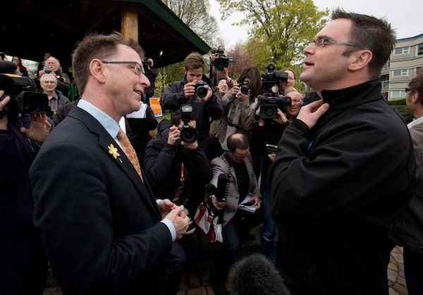 NDP Leader Adrian Dix, left, talks with Education Minister and Liberal candidate for Comox Valley Don McRae after McRae showed up at Dix’s campaign stop in Comox, B.C., on April 18, 2013.Darryl Dyck/The Canadian Press