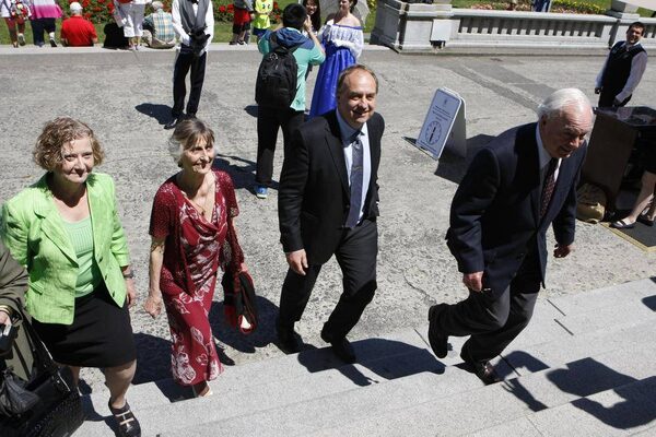 Andrew Weaver, second from right, the new Green Party of B.C. MLA for Oak Bay-Gordon Head, walks up the stairs of the Legislature with Green Party Leader Jane Sterk, left, and his mother Ludmilla Weaver for the swearing-in ceremony inside the Legislature in Victoria on June 6, 2013.Chad Hipolito/The Globe and Mail