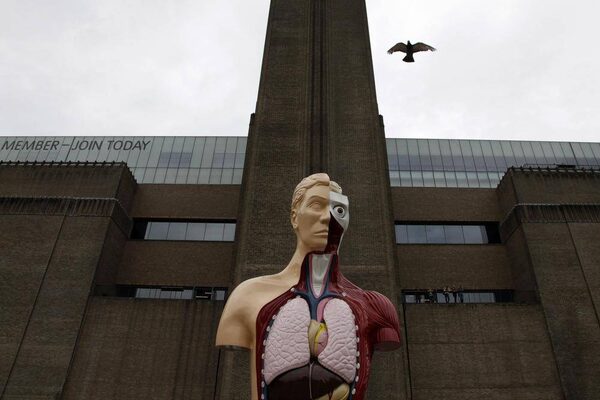 A pigeon flies past the Damien Hirst sculpture Hymn outside the Tate Modern gallery in London in August 2012.Stefan Wermuth/Reuters