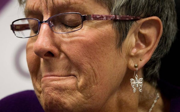Gloria Taylor, who suffers from Lou Gehrig's disease and won a doctor-assisted suicide challenge in B.C. Supreme Court, pauses during a news conference in Vancouver on Monday June 18, 2012. A B.C. Supreme Court judge struck down the laws banning doctor-assisted suicide last week, calling the them discriminatory, disproportionate and overbroad.DARRYL DYCK/The Canadian Press