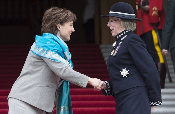 B.C. Premier Christy Clark greets Lieutenant-Governor Judith Guichon prior to the delivery of the Speech from the Throne at the Legislature in Victoria on Feb. 10, 2015.Jonathan Hayward/The Canadian Press